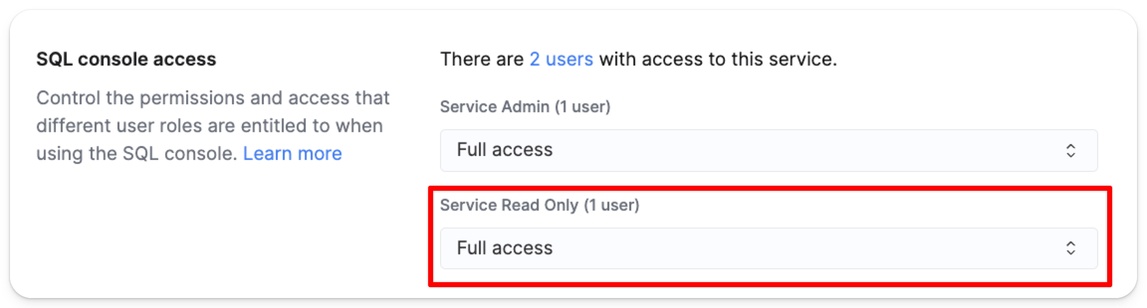 Service Read Only 역할에 대한 액세스 제어 설정을 변경하려면 Service Read Only의 드롭다운 메뉴를 선택합니다: